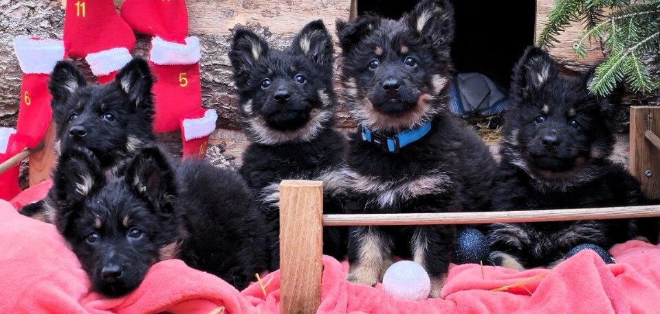9P-Wurf, 8 Wochen alt v.l.n.r. Peaches, Pharos, Pinu'u, Pao Yuko und Philou