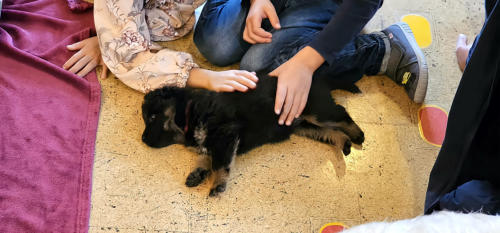 fünf Wochen alt Unsere Welpen haben ihre erste kurze Autofahrt bravourös gemeistert, mit einem spannenden Ziel: Kindergarten Oberhallau! Zweiundzwanzig kleine Hände haben unsere Hundebabies wunderbar auf Kinder geprägt, das ist einfach immer etwas fürs Herz! Ich danke Marlies Baumann und ihren Kindergartenkindern, dass unseren Welpen diese Erfahrung geschenkt werden durfte, und ebenso meinen fleissigen Helfern Tajana, Jessi, Jacqueline, Tatjana, Nathalie und Rosmarie.